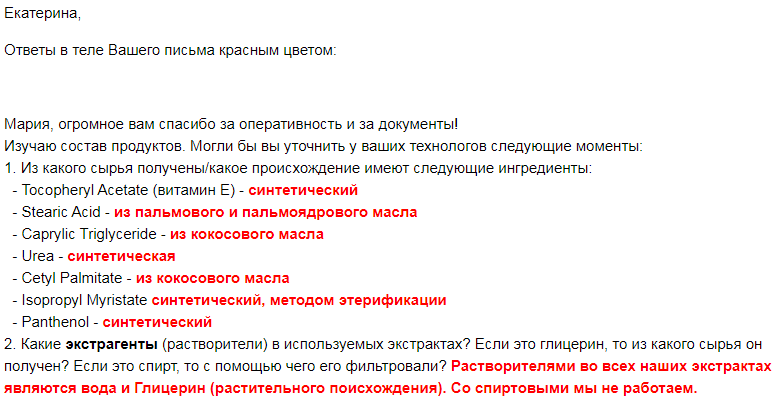- Юзу и Фейхоа: Aqua, Citrus Junos (Yuzu) Fruit Extract (экстракт Юзу), Acca Sellowiana (Feijoa) Extract (экстракт Фейхоа), Vegetable Glycerin (растительный глицерин), Butyrospermum Parkii (Shea) Butter (масло Ши), Cocos Nucifera (Coconut) (масло Кокоса), Prunus Amygdalus Dulcis (Sweet Almond) Oil (масло Миндаля), Euterpe Oleracea (Acai) Fruit Extract (экстракт Ягод Асаи), Stearic Acid, Glyceryl Monostearate, Cetearyl Alcohol, Urea, Phenoxyethanol, Ethylhexylglycerin, Lactic Acid, Perfume, Sodium Hydroxide, Potassium Sorbate, Sodium Benzoate, Limonene, Linalool, Hexyl Cinnamal, Geraniol, Citral, Citronellol, Isoeugenol, Eugenol.