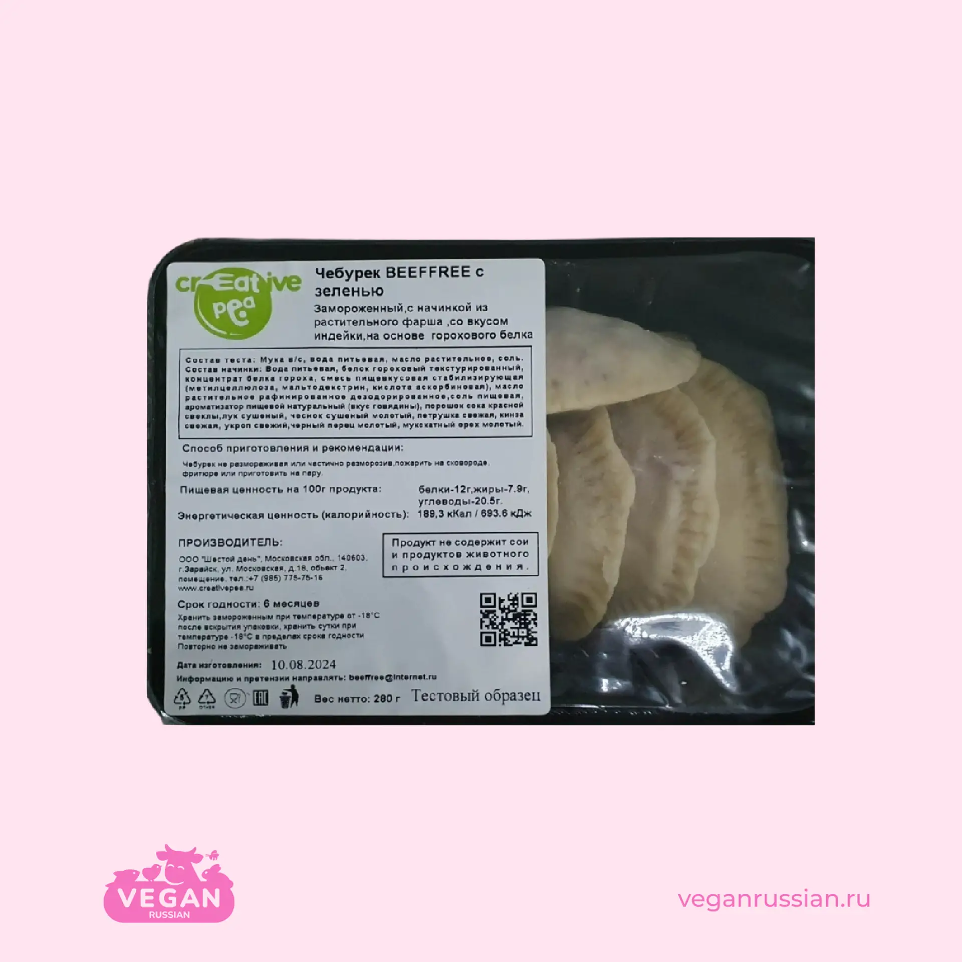 Состав: мука в/с, вода питьевая, масло растительное, соль пищевая, вода питьевая, белок гороховый текстурированный, концентрат белка гороха, масло растительное рафинированное дезодорированное, смесь пищевкусовая стабилизирующая (метилцеллюлоза, мальтодекстрин, кислота аскорбиновая), соль пищевая, ароматизатор пищевой натуральный (вкус говядины), порошок сока красной свеклы, лук сушеный молотый, чеснок сушеный молотый, петрушка свежая, кинза свежая, укроп свежий, перец черный молотый, мускатный орех молотый.