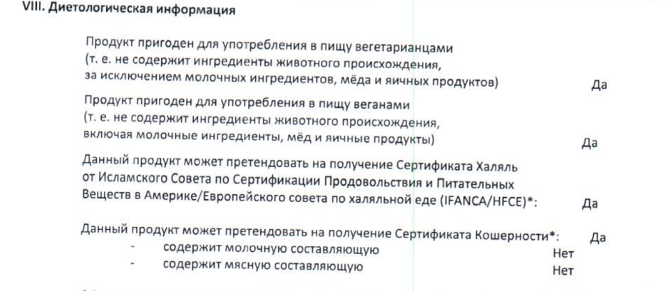 - Спецификация, в которой есть информация для веганов (примеры ниже).