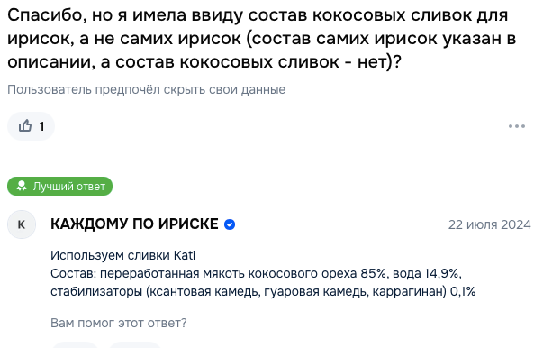Состав: кокосовые сливки (переработанная мякоть кокосового ореха 85%, вода 14,9%, стабилизаторы (ксантовая камедь, гуаровая камедь, каррагинан) 0,1%), сироп топинамбура, финиковый сироп, кокосовое масло.
