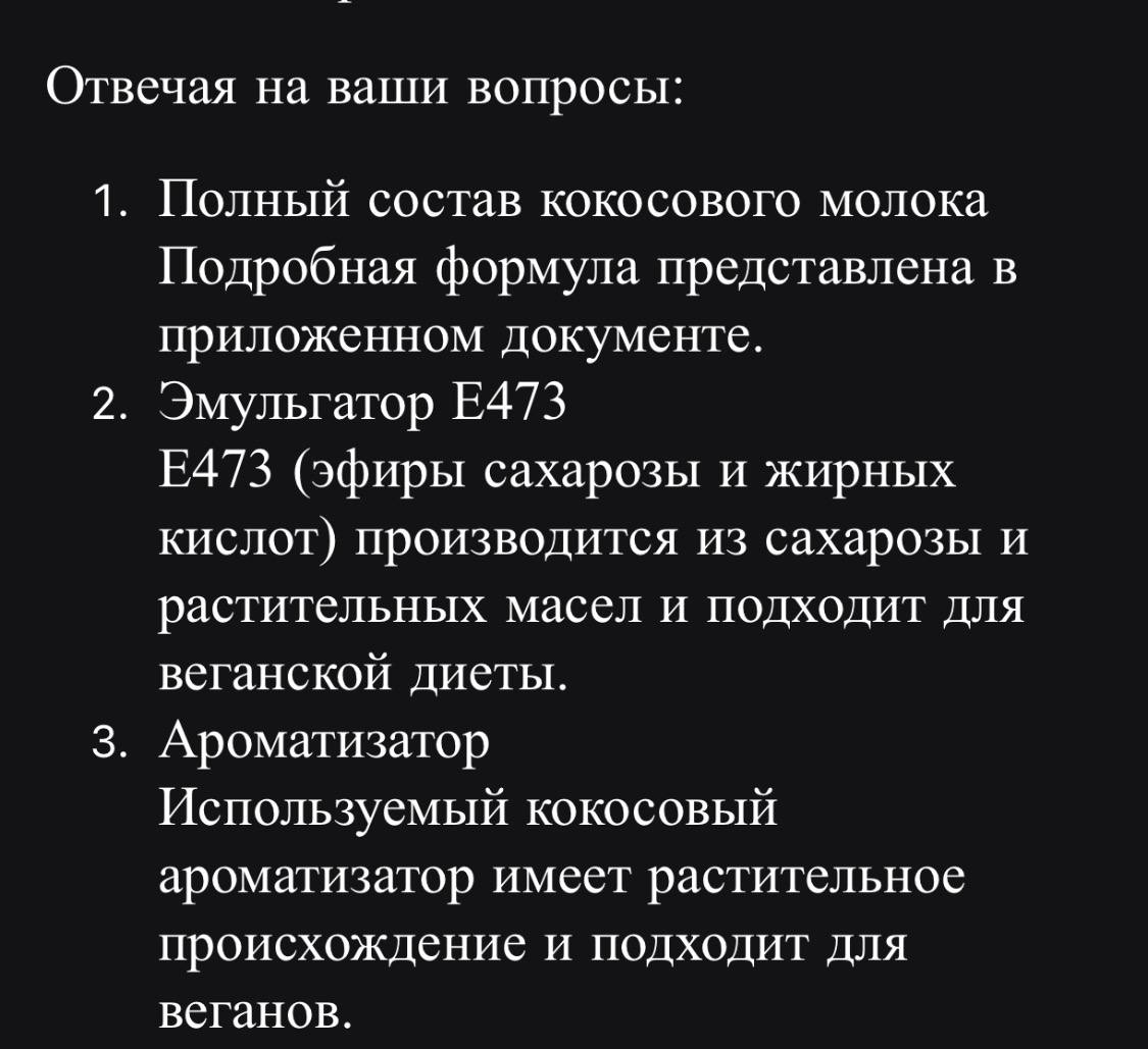 Состав: вода 47%, кокосовая вода 15%, кокосовое молоко 30%, ароматизатор кокоса, ароматизатор манго, сахар, стабилизаторы (Е 407-Карраген, Е412 - гуаровая камедь), эмульгатор Е473, сахароза.
