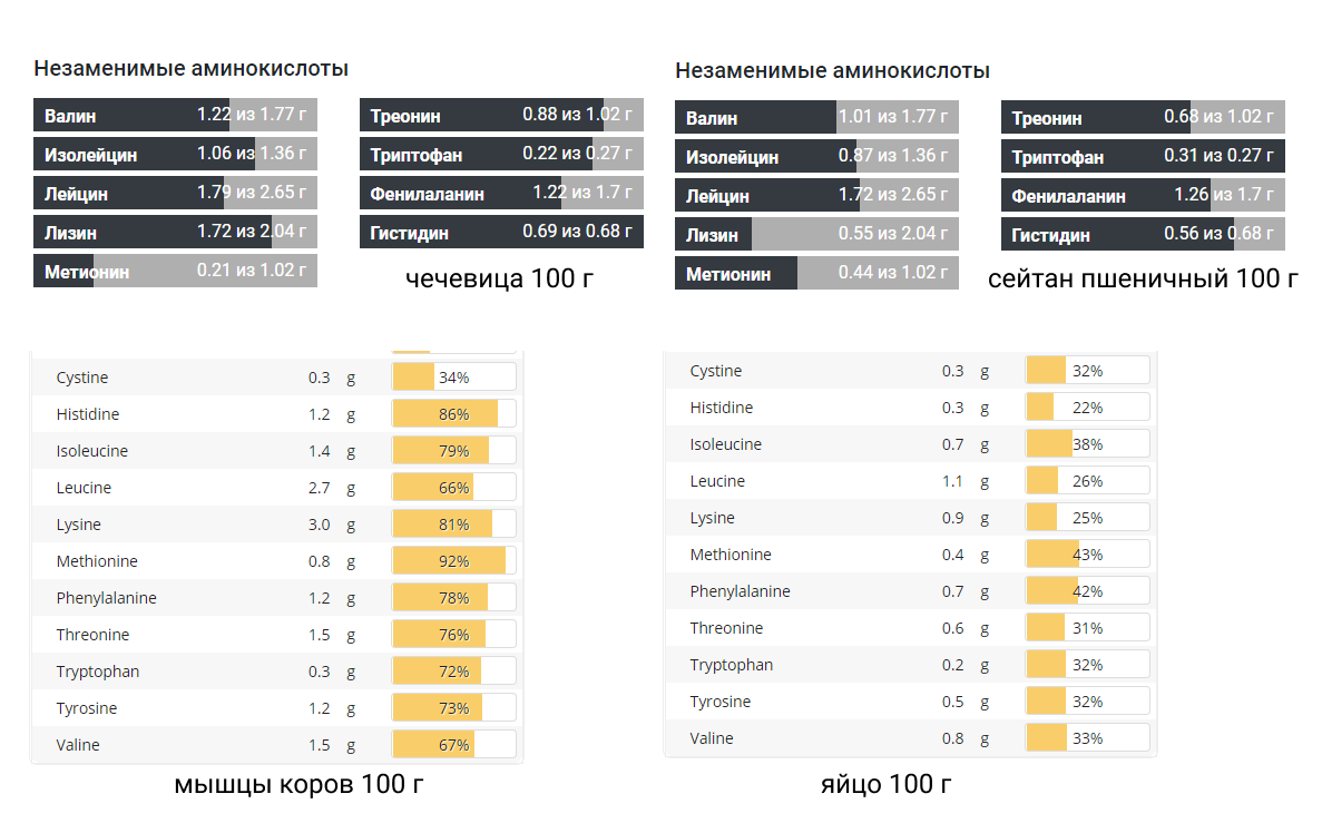 Растительные белки обычно не имеют идеального набора аминокислот. Самый образцовый белок – соевый, в нём достаточно всех незаменимых аминокислот. В других бобовых маловато метионина, а в злаковых – лизина. Решается это просто – сбалансированным питанием. Если питаться разнообразной пищей, то потребность в аминокислотах будет закрыта продуктами из разных групп.