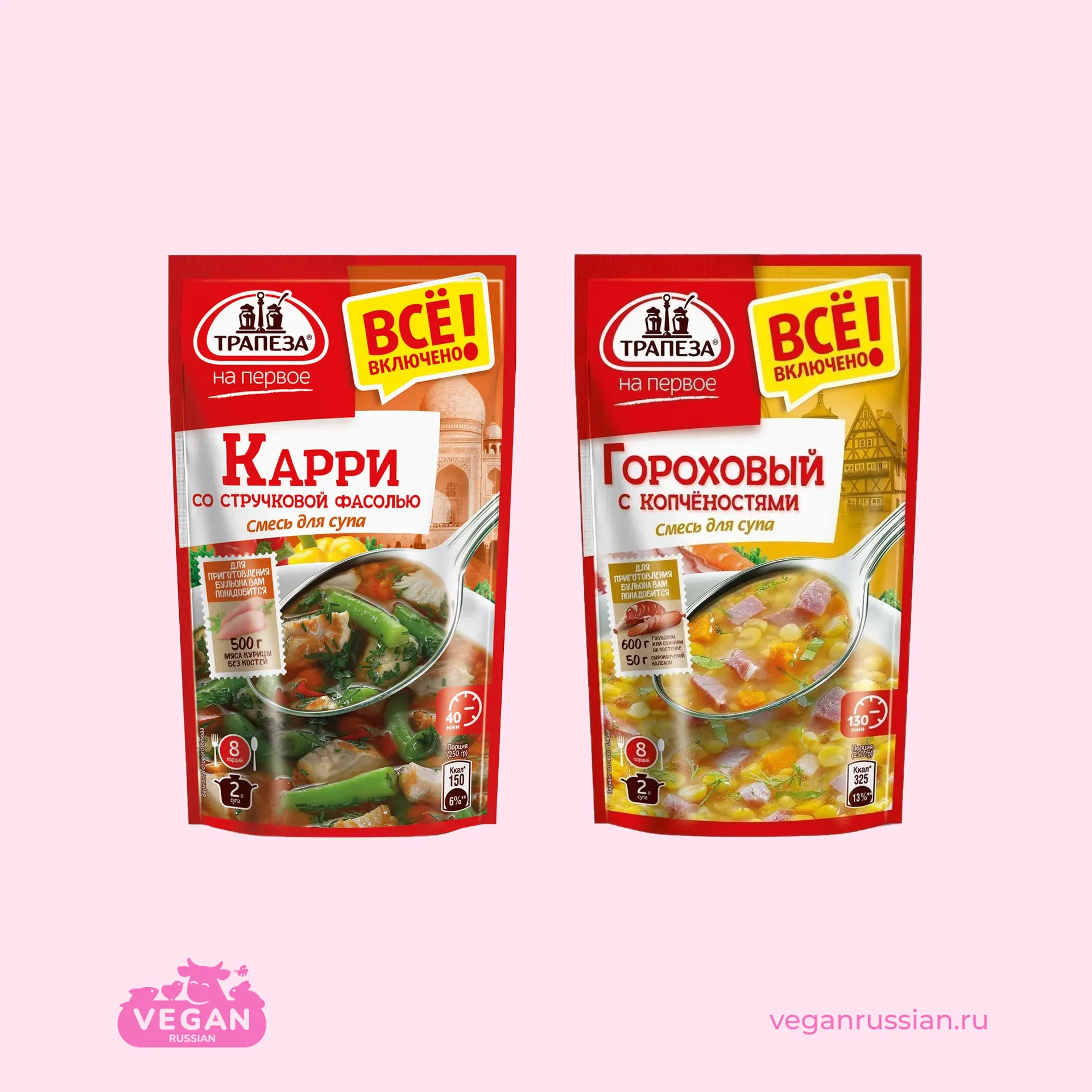 - Гороховый с копчённостями: горох колотый в/с, овощи сушёные (картофель, лук, морковь, чеснок, корень пастернака), морская соль, зелень сушёная (петрушка, укроп), пряности сушёные (перец черный, горчичное семя).