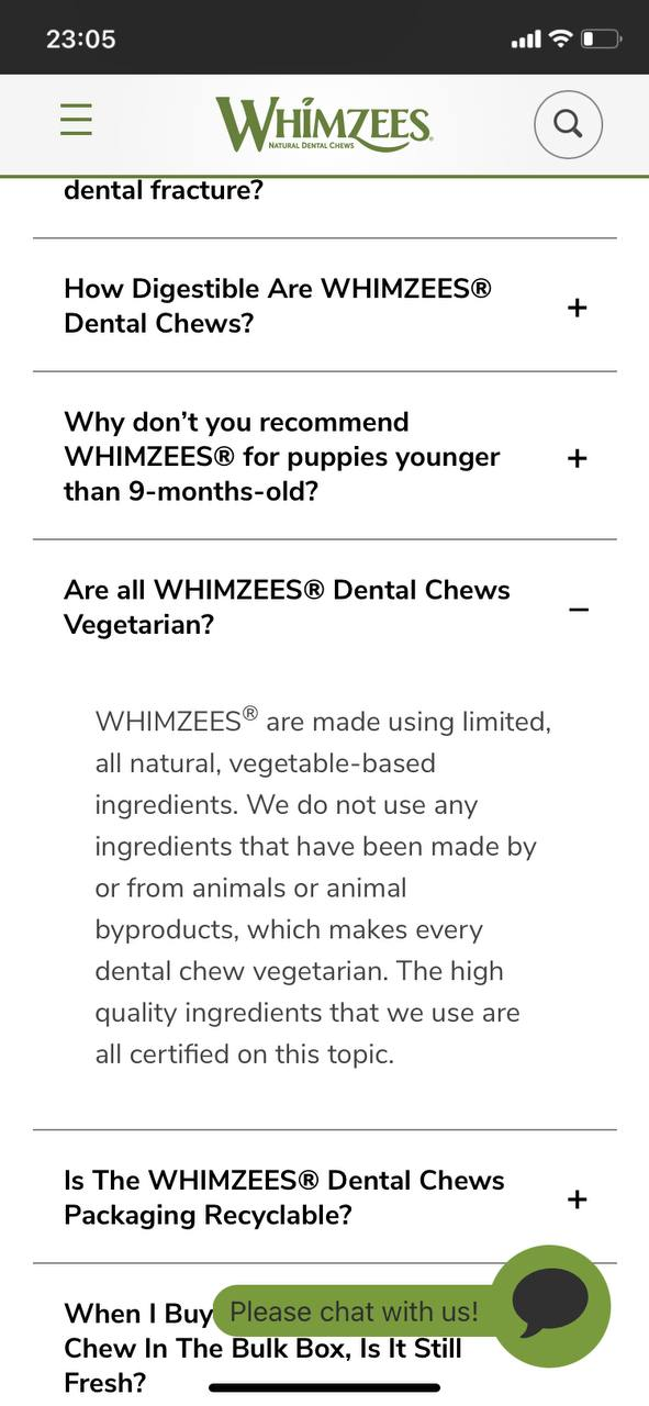В составе лакомств специально подобранные растительные компоненты, отсутствие глютена (благодаря чему лакомства гипоаллергенные, подходят для собак с чувствительным пищеварением), высокое содержание клетчатки (способствует поддержанию здоровья ЖКТ), низкое содержание жира и белка (помогает избежать лишних калорий собакам, склонным к ожирению).