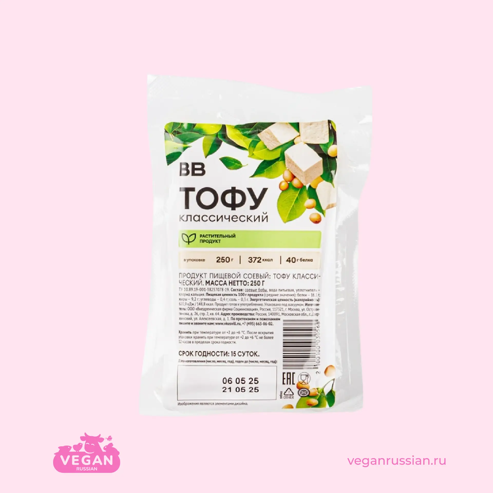 Состав: соевые бобы, вода питьевая, уплотнитель - хлорид кальция.